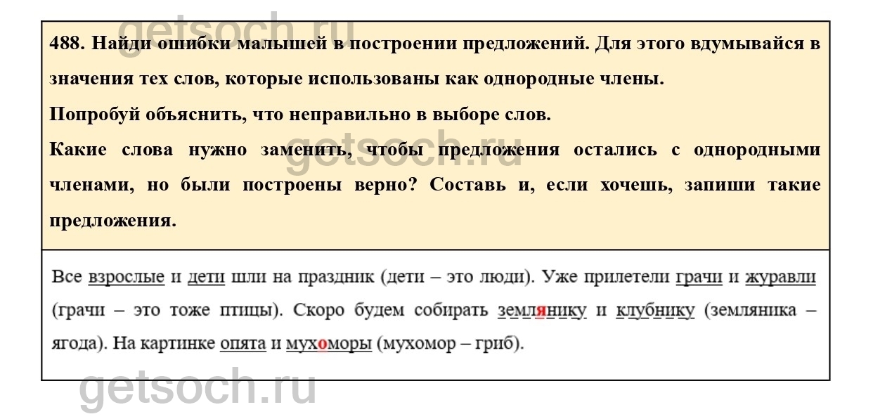 488. Найди ошибки малышей в построении предложений. Для этого вдумывайся в значения тех слов, которые использованы как однородные члены.