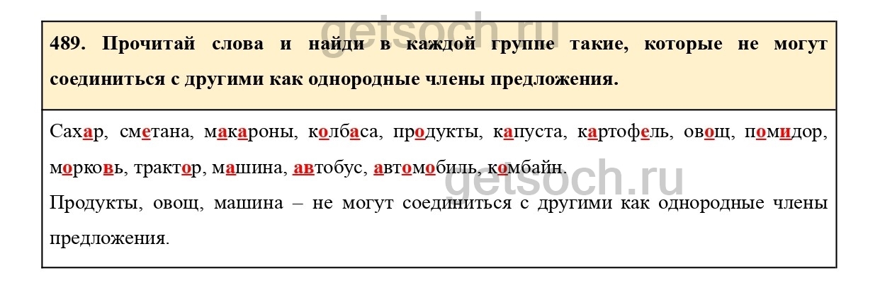 489. Прочитай слова и найди в каждой группе такие, которые не могут соединиться с другими как однородные члены предложения.