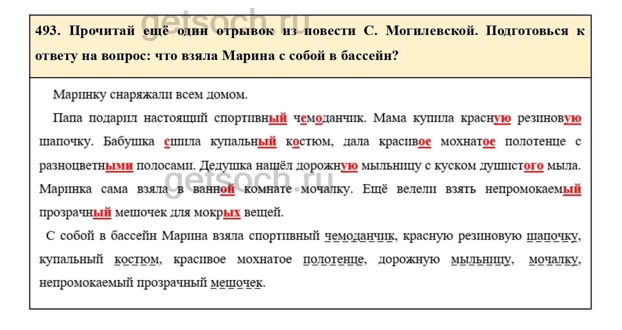 493. Прочитай ещё один отрывок из повести С. Могилевской. Подготовься к ответу на вопрос: что взяла Марина с собой в бассейн?