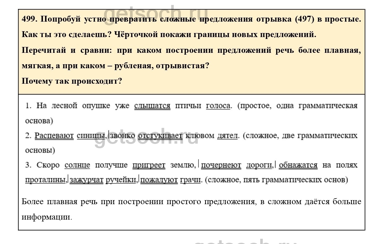 499. Попробуй устно превратить сложные предложения отрывка (497) в простые. Как ты это сделаешь? Чёрточкой покажи границы новых предложений.