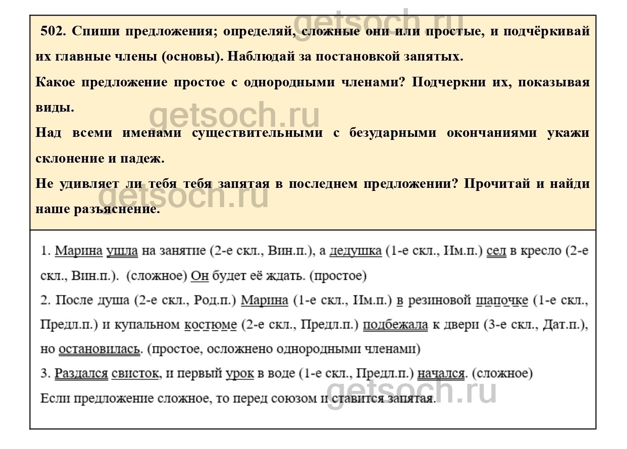502. Спиши предложения; определяй, сложные они или простые, и подчёркивай их главные члены (основы). Наблюдай за постановкой запятых.