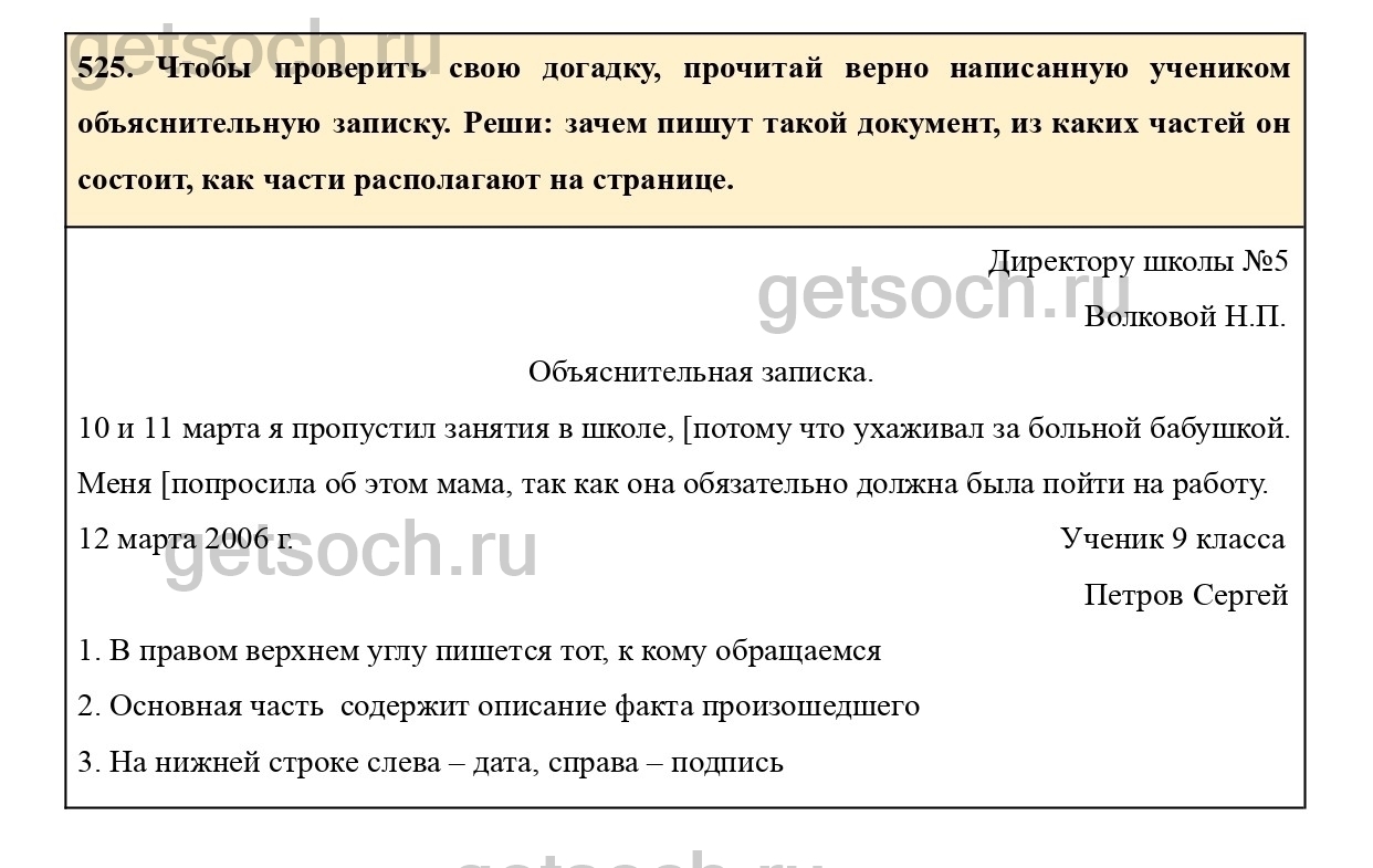 525. Чтобы проверить свою догадку, прочитай верно написанную учеником объяснительную записку. Реши: зачем пишут такой документ, из каких частей он состоит, как части располагают на странице.