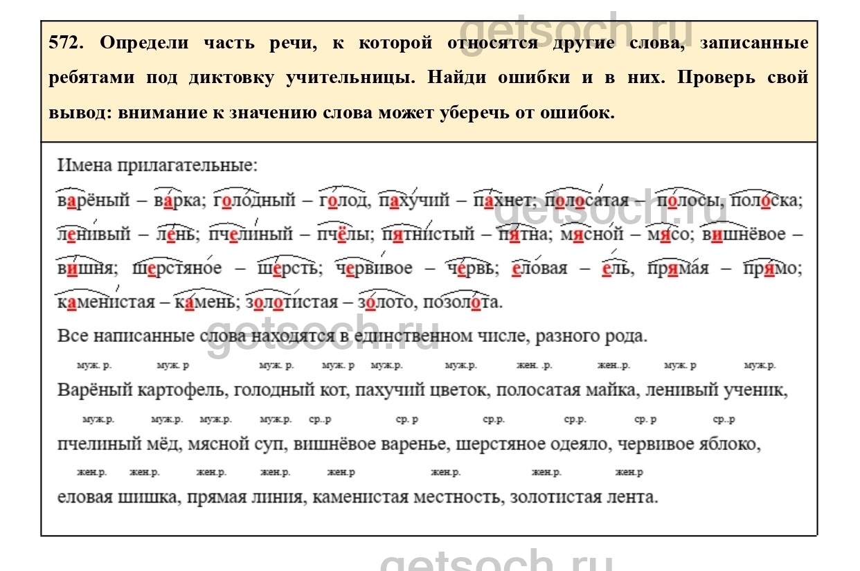 572. Определи часть речи, к которой относятся другие слова, записанные ребятами под диктовку учительницы. Найди ошибки и в них. Проверь свой вывод: внимание к значению слова может уберечь от ошибок.