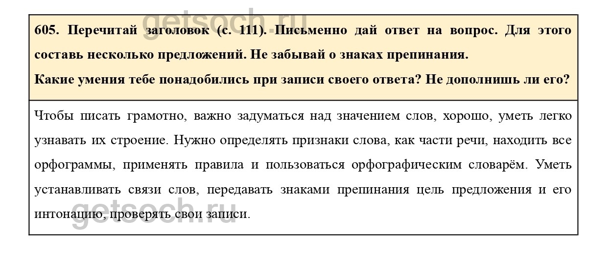 605. Перечитай заголовок (с. 111). Письменно дай ответ на вопрос. Для этого составь несколько предложений. Не забывай о знаках препинания.