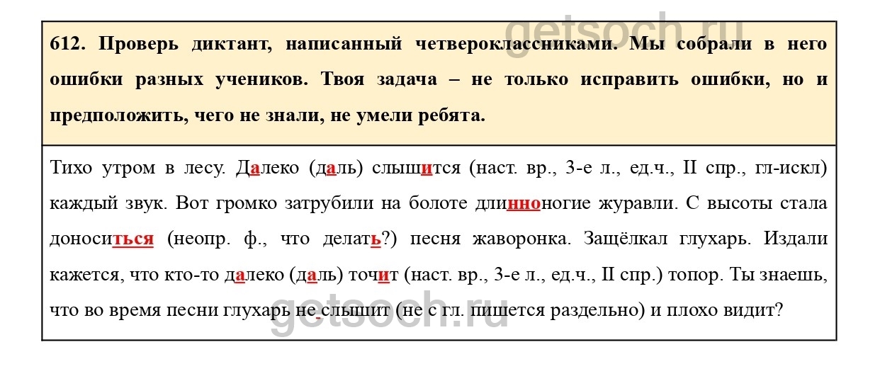 612. Проверь диктант, написанный четвероклассниками. Мы собрали в него ошибки разных учеников. Твоя задача – не только исправить ошибки, но и предположить, чего не знали, не умели ребята.