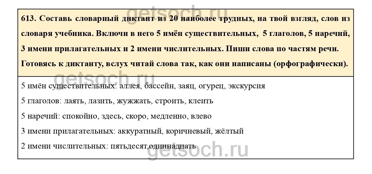 613. Составь словарный диктант из 20 наиболее трудных, на твой взгляд, слов из словаря учебника. Включи в него 5 имён существительных, 5 глаголов, 5 наречий, 3 имени прилагательных и 2 имени числительных. Пиши слова по частям речи.