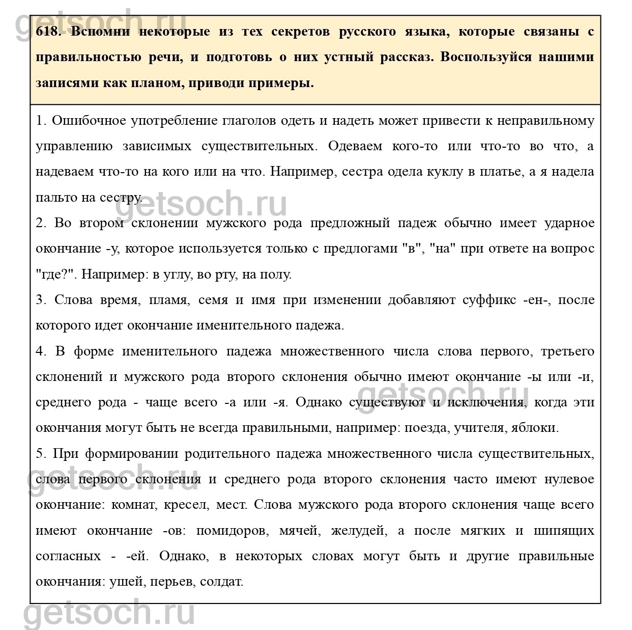 618. Вспомни некоторые из тех секретов русского языка, которые связаны с правильностью речи, и подготовь о них устный рассказ. Воспользуйся нашими записями как планом, приводи примеры.