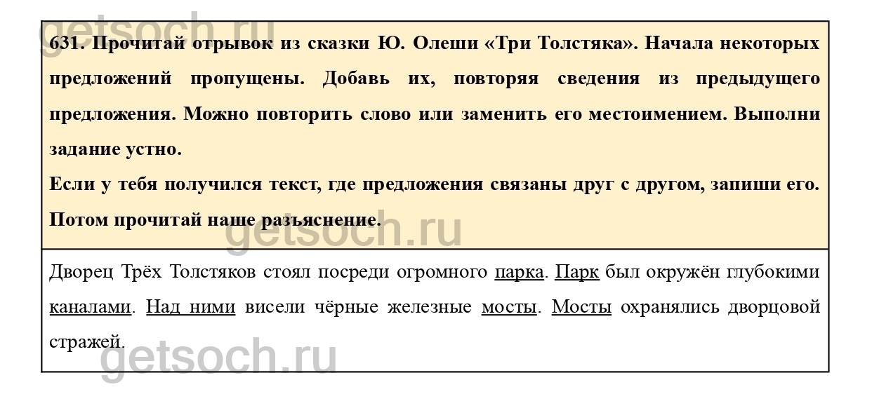 631. Прочитай отрывок из сказки Ю. Олеши «Три Толстяка». Начала некоторых предложений пропущены. Добавь их, повторяя сведения из предыдущего предложения. Можно повторить слово или заменить его местоимением. Выполни задание устно.