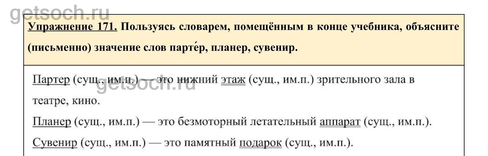 Пользуясь словарём, помещённым в конце учебника, объясните (письменно) значение слов партер, сувенир, шарада.Образец. Маяк (сущ., им. п.) — это башня (сущ., им. п.) с сигнальными огнями для ориентировки проходящих судов.