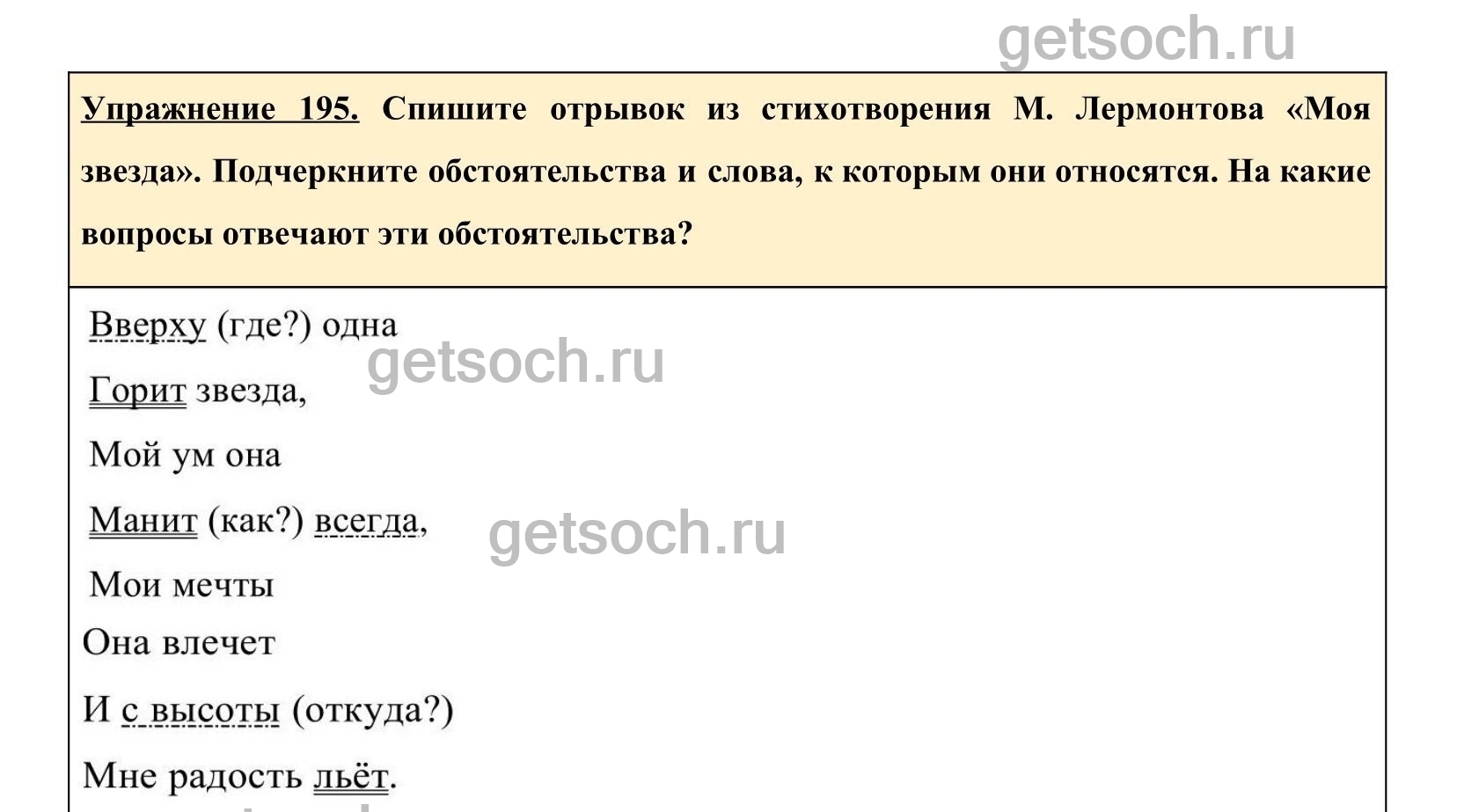 Спишите отрывок из стихотворения М. Лермонтова «Моя звезда». Подчеркните обстоятельства и слова, к которым они относятся. На какие вопросы отвечают эти обстоятельства?Вверху однаГорит звезда,Мой ум онаМанит всегда,Мои мечтыОна влечётИ с высотыМне радость льёт.
