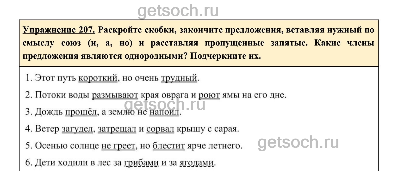 Раскройте скобки, закончите предложения, вставляя нужный по смыслу союз (и, а, но) и расставляя пропущенные запятые. Какие члены предложения являются однородными? Подчеркните их.1. Этот путь к..роткий (очень трудный). 2. Потоки в..ды размывают края оврага (роют ямы на его дне). 3. Дождь прошёл (землю не напоил). 4. Ветер загудел, затр..щал (сорвал крышу с сарая). 5. Осенью солнце не греет (блестит ярче летнего). 6. Дети х..дили в лес за грибами (за ягодами).