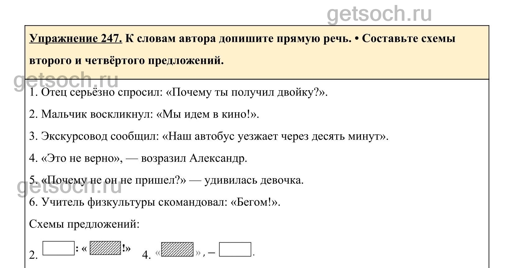 К словам автора допишите прямую речь. • Составьте схемы второго и четвёртого предложений. В каких словах автора речь говорящего характеризуется с помощью наречий?1. Экскурсовод сообщил: – – . 2. Отец серьёзно спросил: – – ? 3. Мальчик радостно воскликнул: – – ! 4. – – , — неуверенно возразил Александр. 5. – – ? — удивилась девочка. 6. – – ! — кричали болельщики. 7. Учитель физкультуры скомандовал: – – !