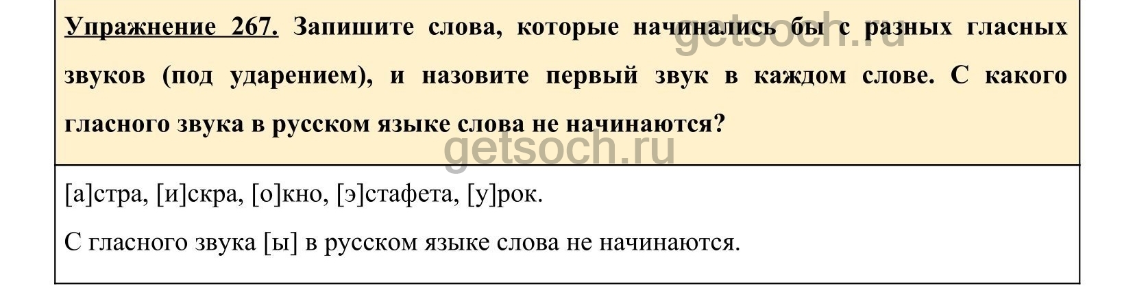 Запишите слова, которые начинались бы с разных гласных звуков (под ударением), и назовите первый звук в каждом слове. С какого гласного звука в русском языке слова не начинаются?