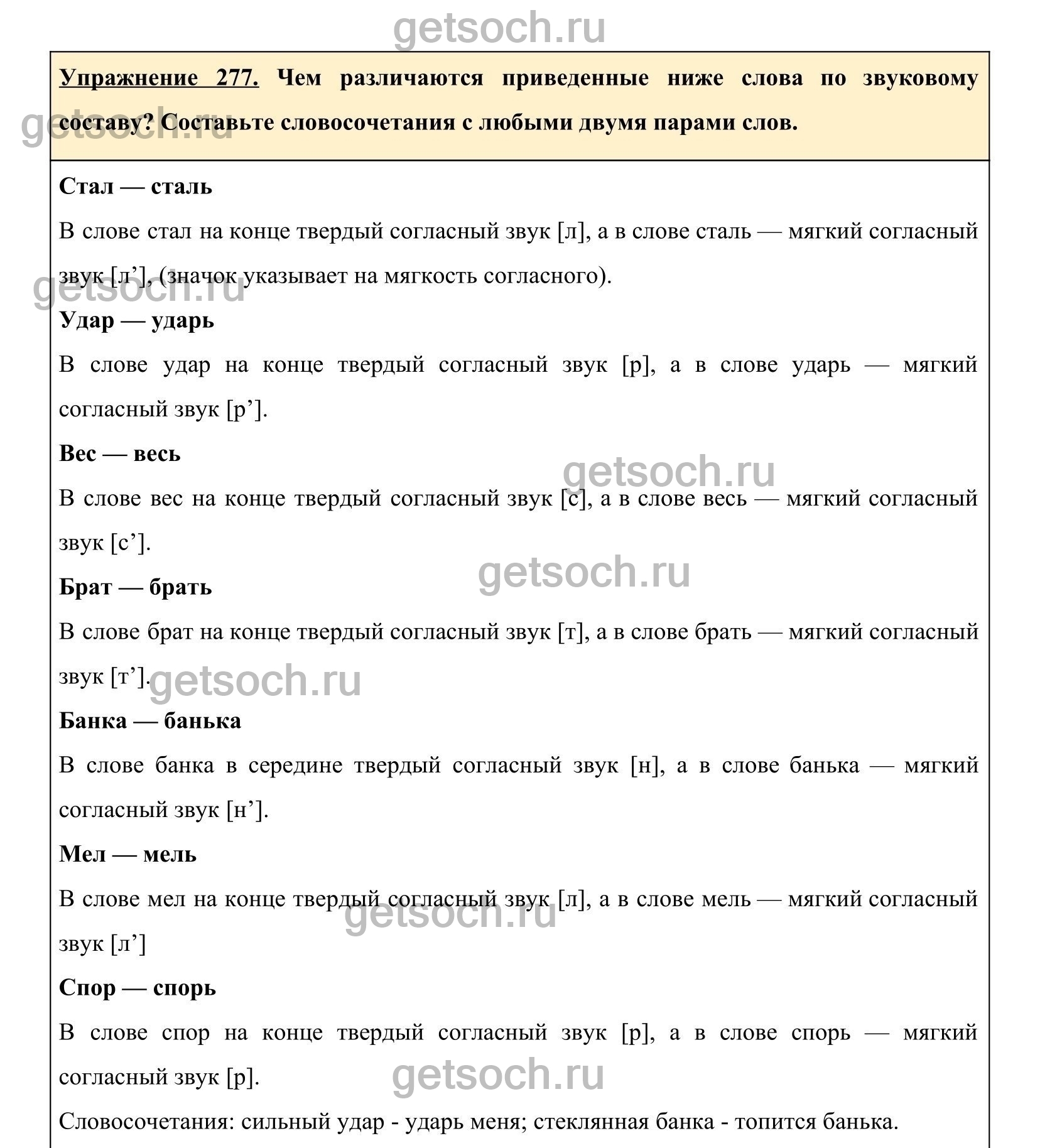 Чем различаются приведённые ниже слова по звуковому составу? Составьте словосочетания с любыми двумя парами слов. Образец ответа. В слове ел на конце твёрдый согласный звук [л], а в слове ель – мягкий согласный звук [л’] (значок ’ указывает на мягкость согласного). Стал — сталь, удар — ударь, вес — весь, брат — брать, банка — банька, мел — мель, спор — спорь.