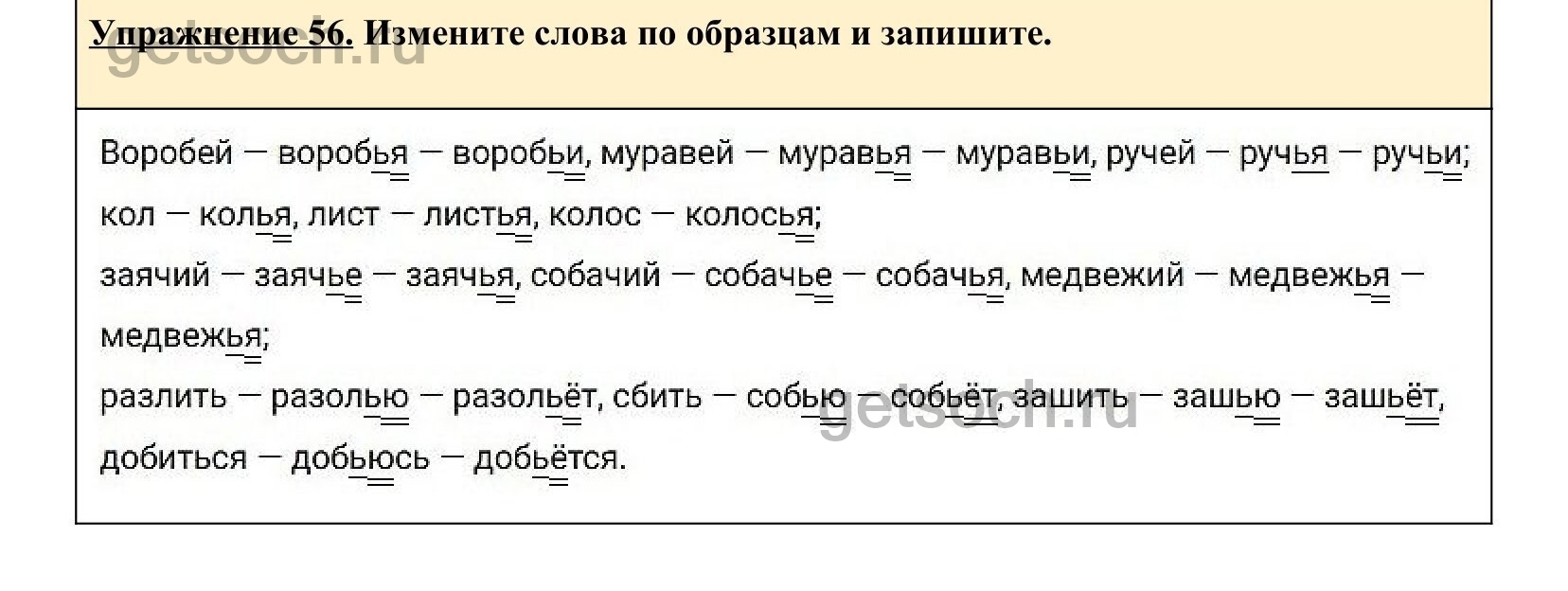 Измените слова по образцам и запишите. Воробей – воробья – воробьи, муравей, ручей;кол – колья, лист, колос;заячий – заячье – заячья‚ собачий, медвежий;разлить – разолью – разольёт, сбить, зашить, добиться.
