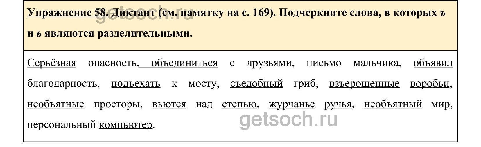 Диктант (см. памятку на с. 169). Подчеркните слова, в которых ь и ъ являются разделительными. Сер(?)ёзная опас(?)ность, об(?)единиться с друз(?)ями, пис(?)мо мал(?)чика, об(?)явил благодарность, под(?)ехать к мосту, с(?)едобный гриб, вз(?)ерошенные вороб(?)и, необ(?)ятные пр..сторы, в(?)ются над степ(?)ю, жуч..нье руч(?)я, необ(?)ятный мир, персонал(?)ный комп(?)ютер.