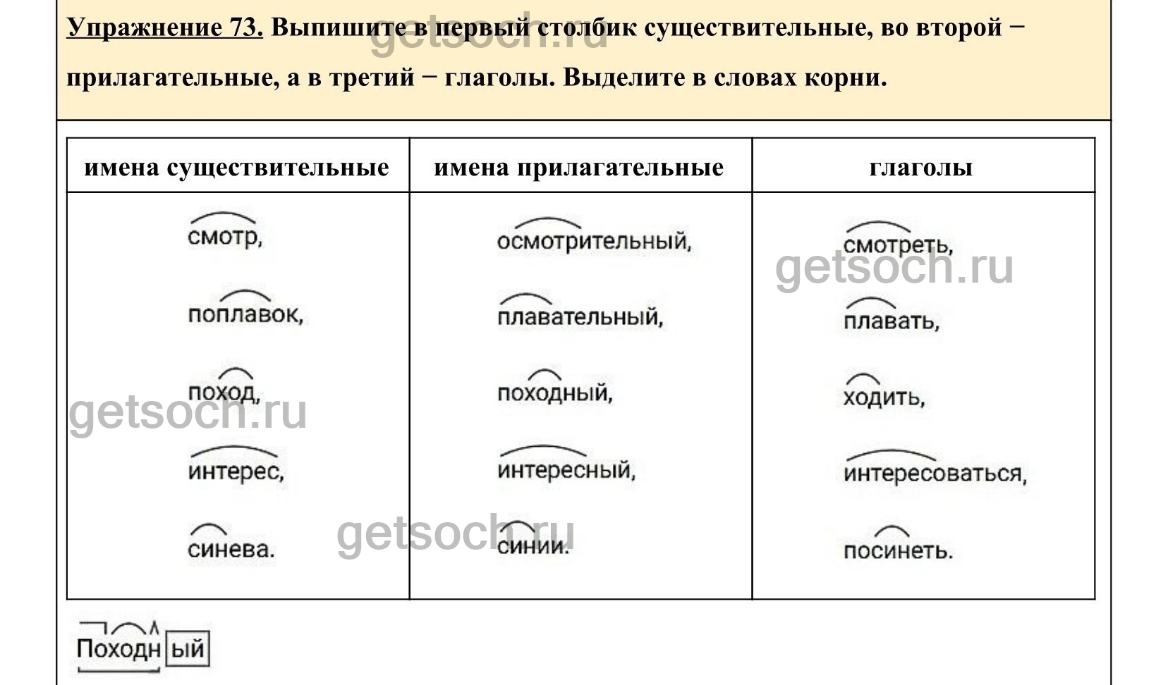 Выпишите в первый столбик существительные, во второй – прилагательные, а в третий – глаголы. Выделите в словах корни. Смотреть, смотр, осмотрительный; поплавок, плавательный, плавать; поход, походный2, ходить; интерес, интересоваться, интересный; синий, синева, посинеть.