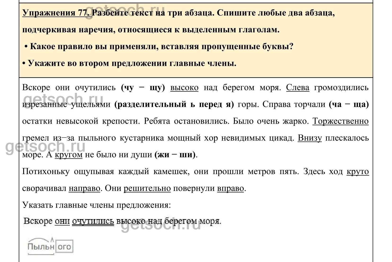 Разбейте текст на три абзаца. Спишите любые два абзаца, подчёркивая наречия, относящиеся к выделенным глаголам. • Какое правило вы применяли, вставляя пропущенные буквы? • Укажите во втором предложении главные члены. Быстро, но осторожно Владик и Толька перебегали доро..ки, ныряли в ч..щу кустарника, ползли вверх, спускались вниз, ничего не оставляя на своём пути незамеченным. Вскоре они оч..тились высоко над берегом моря. Слева громоздились изрезанные ущел(?)ями горы. Справа торч..ли остатки невысокой крепости. Ребята остановились. Было очень жарко. Торжественно гремел из-за пыльного2 кустарника мощный хор невидимых цикад. Внизу плескалось море. А кругом не было ни душ.. . Потихоньку ощупывая каждый камешек, они прошли метров пять. Здесь ход круто сворачивал направо. Они решительно повернули вправо.(А. Гайдар)