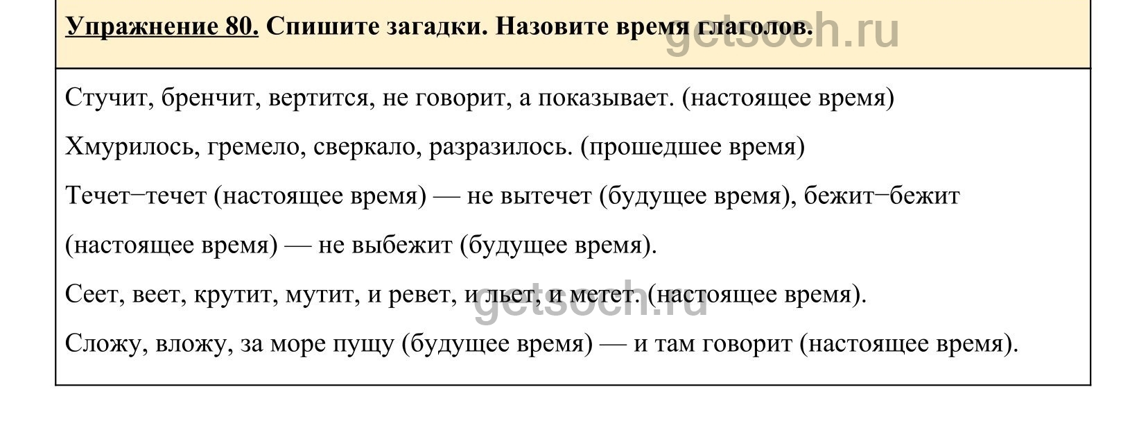 Спишите загадки. Обозначьте время глаголов (настоящее, прошедшее или будущее). 1. Стучит, бренчит, вертится, не говорит, а показывает. (Часы.) 2. Хмурилось, гремело, сверкало, разразилось. (Гроза) 3. Течёт1, течёт — не вытечет; бежит, бежит — не выбежит. (Река.) 4. Сеет, веет, крутит, мутит, и ревёт, и льёт, и метёт. (Погода осенью.) 5. Сложу, вложу, за море пущу — и там говорит. (Письмо.)