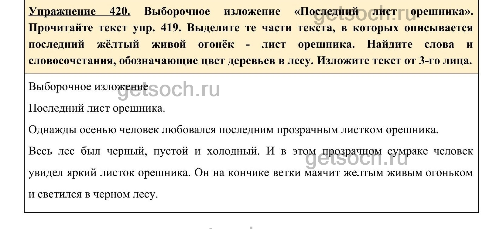 Выборочное изложение «Последний лист орешника». Прочитайте текст упр. 455. Выделите те части текста, в которых описывается последний жёлтый живой огонёк – лист орешника. Найдите слова и словосочетания, обозначающие цвет деревьев в лесу. Изложите текст от 3-го лица.