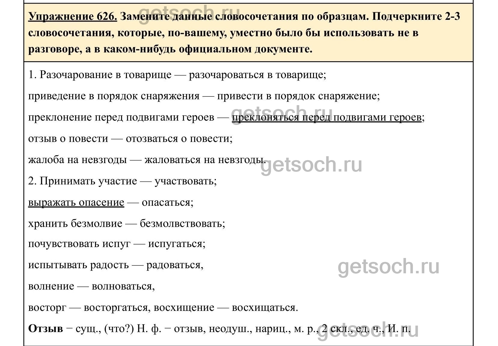 Замените данные словосочетания по образцам. Подчеркните 2-3 словосочетания, которые, по-вашему, уместно было бы использовать не в разговоре, а в каком-нибудь официальном документе.1. Упрёк в трусости — упрекать в трусости; разоч..рование в товарище, приведение в порядок снаряжения, преклонение перед подвигами героев, отзыв3 о повеcт.., жалоба на невзгоды*.2. Принимать участие — участвовать; выражать опасение, хранить безмолвие, почувствовать испуг, испытывать радость, волнение, восторг, восхищение.