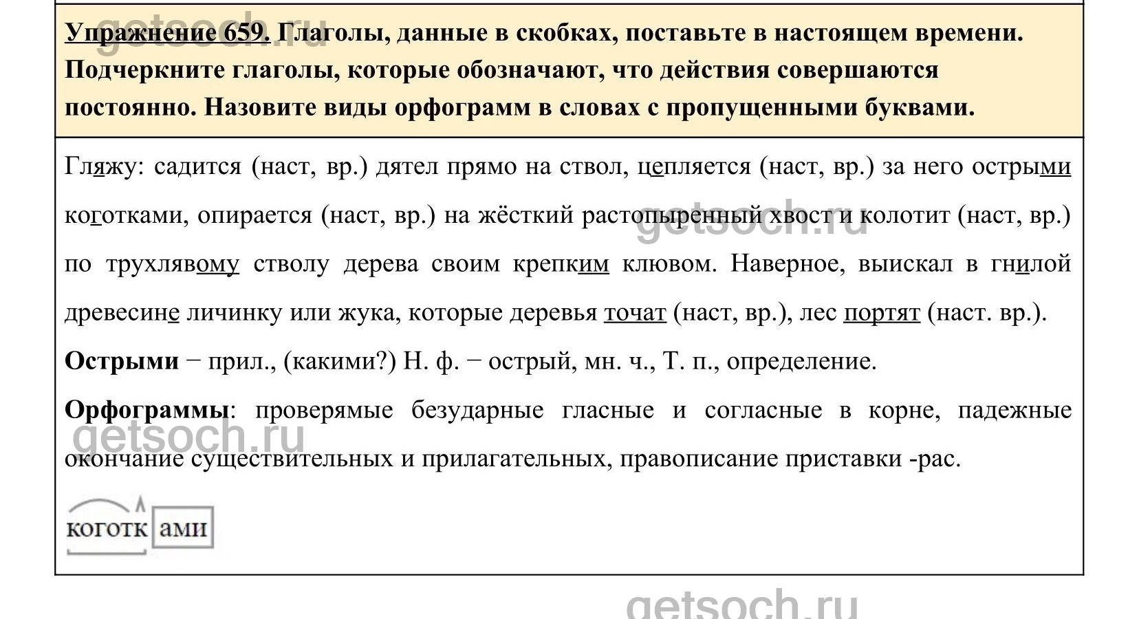Глаголы, данные в скобках, поставьте в настоящем времени. Подчеркните глаголы, которые обозначают, что действия совершаются постоянно. Назовите виды орфограмм в словах с пропущенными буквами.Гл..жу: (садился) дятел прямо на ствол, (ц..плялся) за него остры..3 кого..ками2, (опирался) на жёстк.. ра(с, сс)топыренный хвост и (колотил) по трухляв.. стволу дерева своим крепк.. клювом. Наверное, выискал в гн..лой древесин.. личинку или жука, которые деревья (точили), лес (портили).