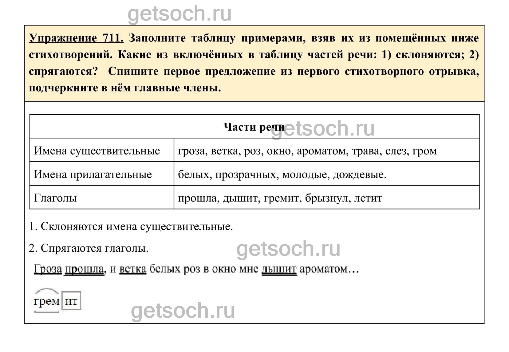 Заполните таблицу примерами, взяв их из помещённых ниже стихотворений. Какие из включённых в таблицу частей речи: 1) склоняются; 2) спрягаются? • Спишите первое предложение из первого стихотворного отрывка, подчеркните в нём главные члены. Части речи Имена существительные Имена прилагательные Глаголы 1. Гроза прошла, и ветка белых розВ окно мне дышит ароматом…Ещё трава полна прозрачных слёз,И гром вдали гремит2 раскатом.(А. Блок)2. Гремят раскаты молодые,Вот дожлик брызнул, пыль летитПовисли перлы дождевыеИ солнце нити золотит.(Ф. Тютчев)