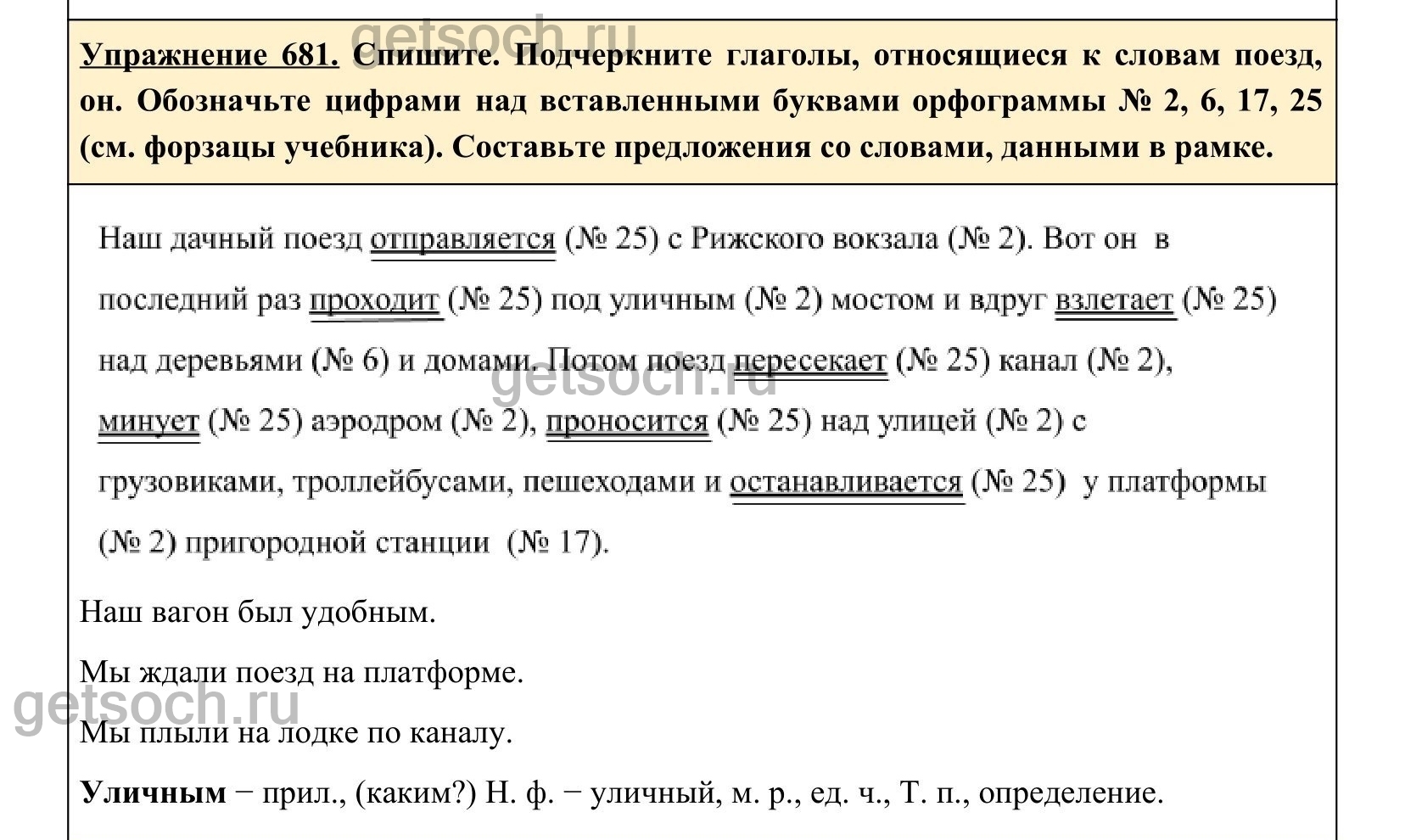 Спишите. Подчеркните глаголы, относящиеся к словам поезд, он. Обозначьте все орфограммы в корнях слов. Составьте предложения со словами, данными в рамке.вагонплатформаканал Наш дачный поезд отправляется с Рижского во..зала. Вот он в последний раз проход..т под ул..чным3 мостом и вдруг взлета..т над дерев(?)ями и домами. Потом поезд пересека..т к..нал, мину..т аэр..дром, пронос..тся над ул..цей с грузовиками, троллейбусами, пешеходами и останавливается у пл..тформы пригородной станц.. .