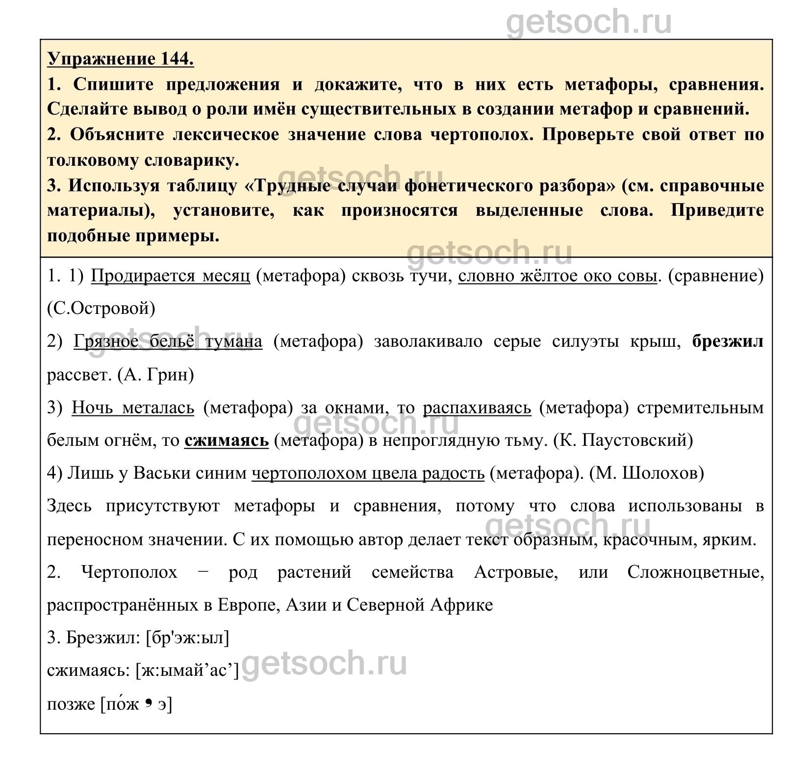 Рассмотрим ответы на Упражнение 144 из учебника по русскому языку для 6 класса Разумовской