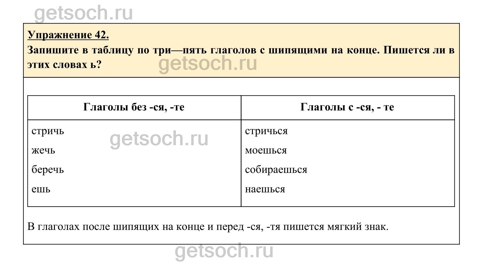 Запишите в таблицу по три—пять глаголов с шипящими на конце. Пишется ли в