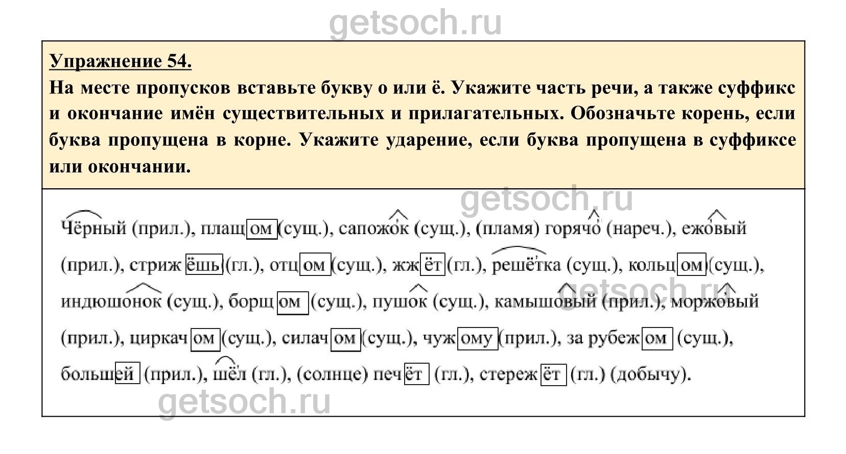 На месте пропусков вставьте букву о или ё. Укажите часть речи, а также суффикс