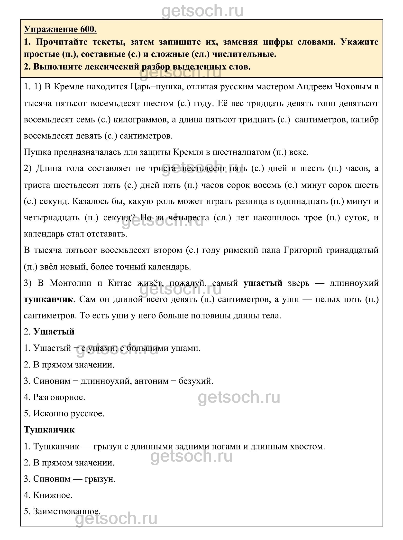 Рассмотрим ответы на Упражнение 600 из учебника по русскому языку для 6 класса Разумовской