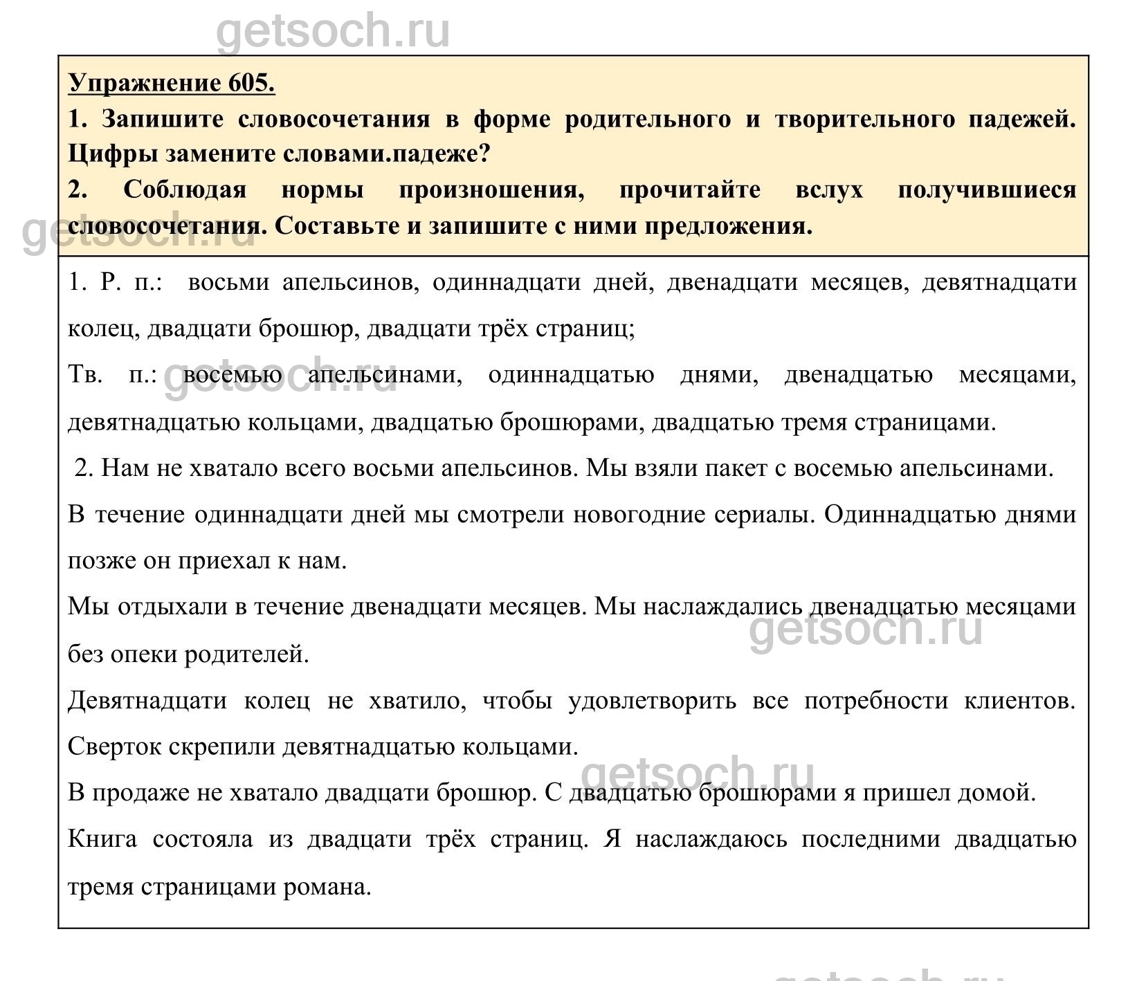 Рассмотрим ответы на Упражнение 605 из учебника по русскому языку для 6 класса Разумовской