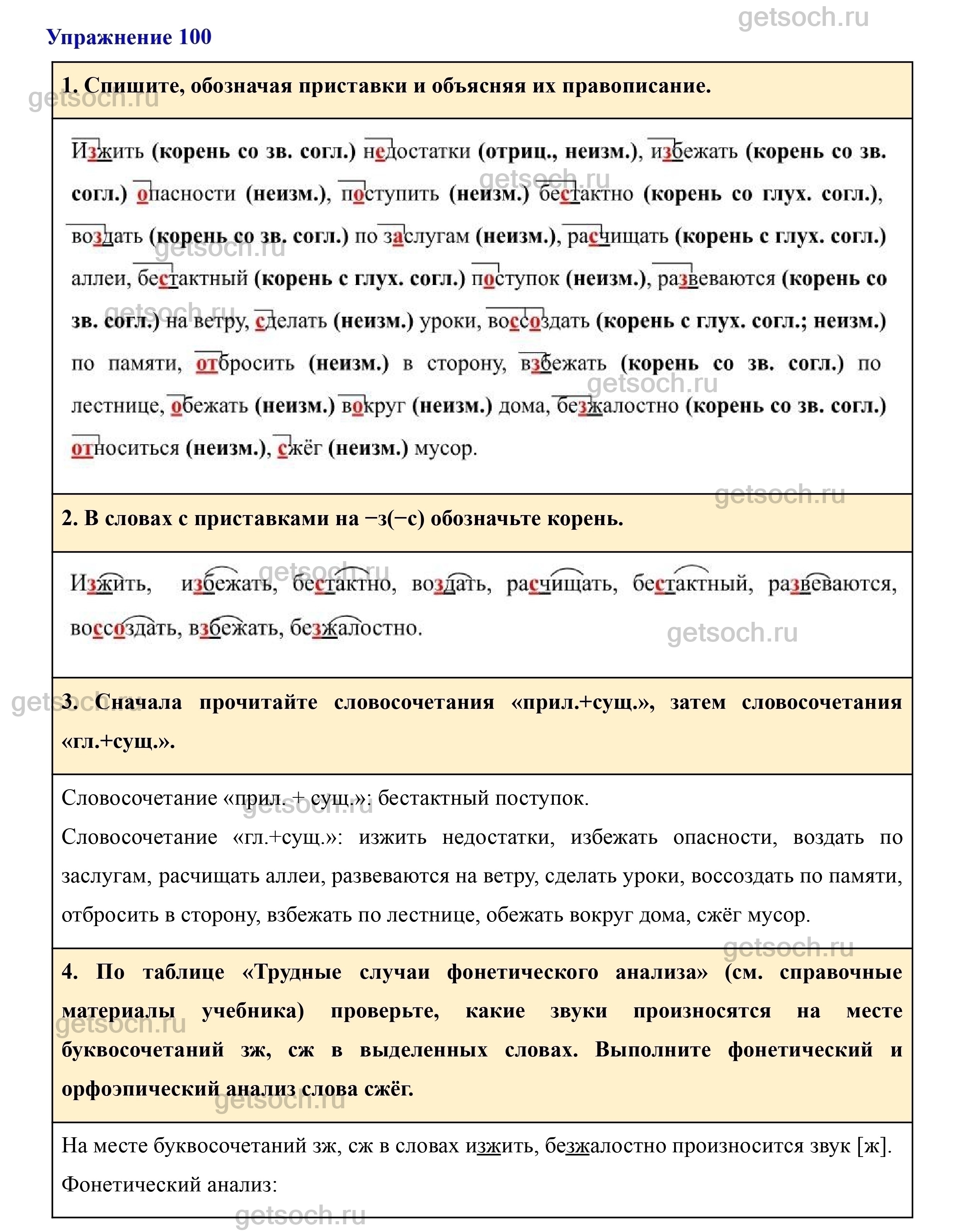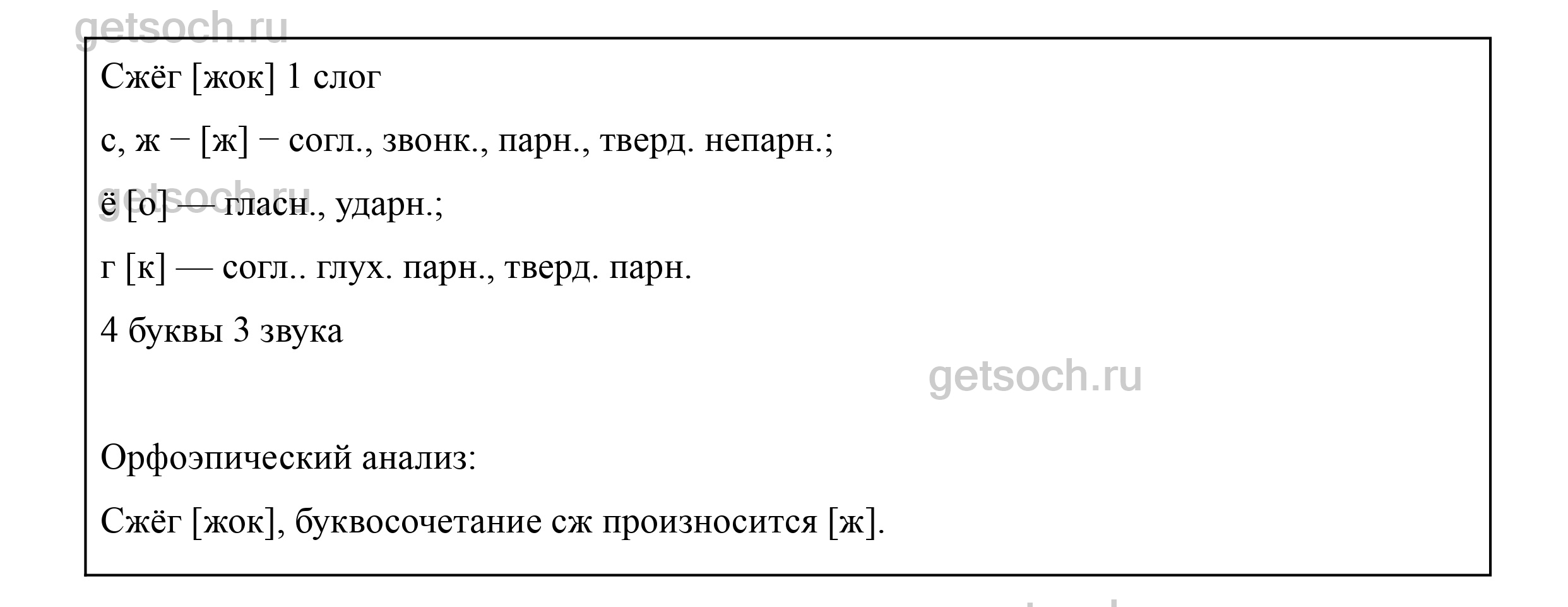 4. По таблице «Трудные случаи фонетического анализа» (см. справочные материалы учебника) проверьте, какие звуки произносятся на месте буквосочетаний зж, сж в выделенных словах. Выполните фонетический и орфоэпический анализ слова сжёг.