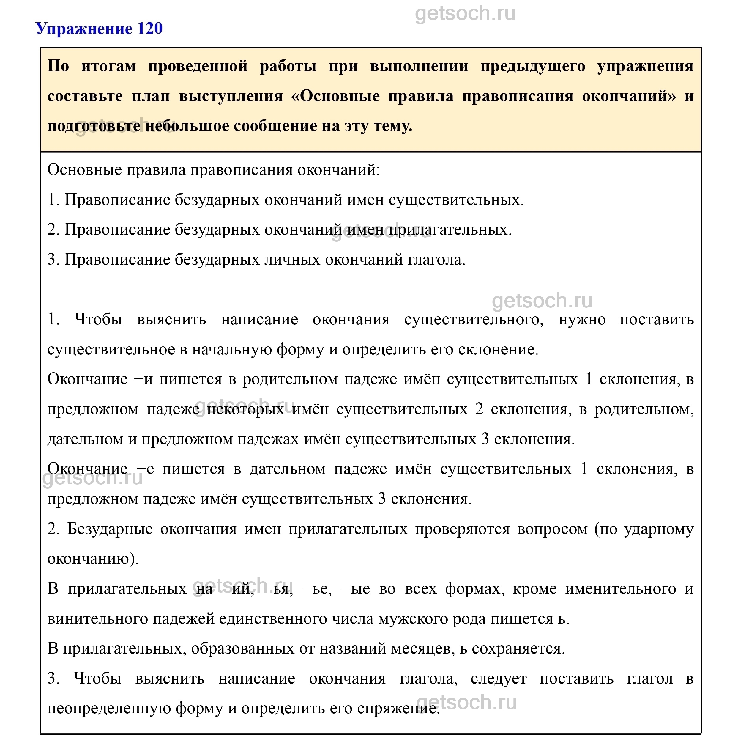 По итогам проведенной работы при выполнении предыдущего упражнения составьте план выступления «Основные правила правописания окончаний» и подготовьте небольшое сообщение на эту тему.