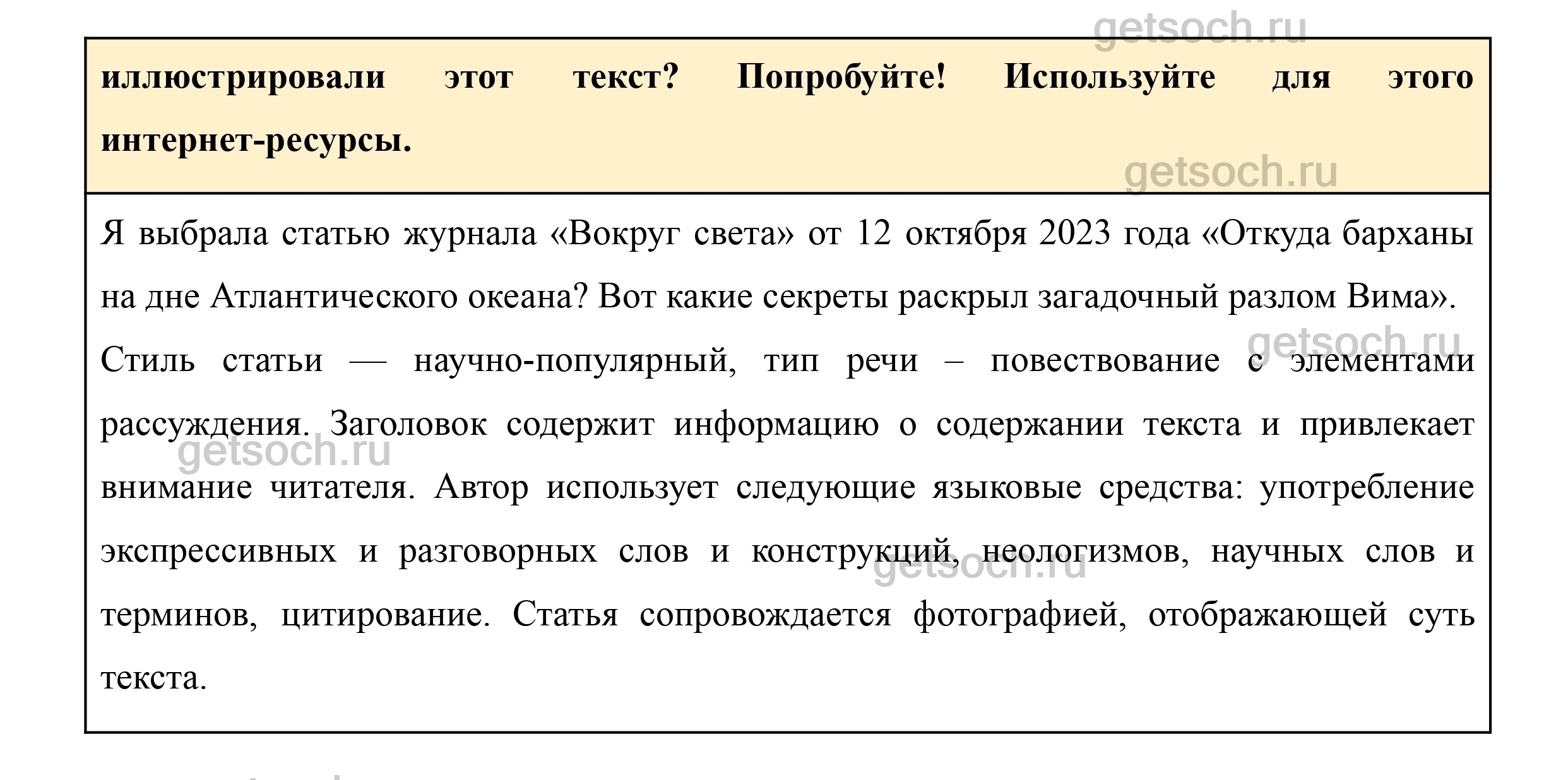 2. В библиотеке (домашней, школьной, районной) или в Интернете найдите один из выпусков журнала «Вокруг света. Выберите заметку, в которой содержится заинтересовавшая вас информация. Проанализируйте текст, определяя его принадлежность к стилю, типу речи, оцените заголовок, использование языковых средств, помогающих автору заинтересовать читателя и передать ему важную информацию. Сопровождается ли текст рисунком, фотографией? Удачно ли они, по вашему мнению, соотносятся с содержанием заметки и почему? А как бы вы иллюстрировали этот текст? Попробуйте! Используйте для этого интернет-ресурсы.