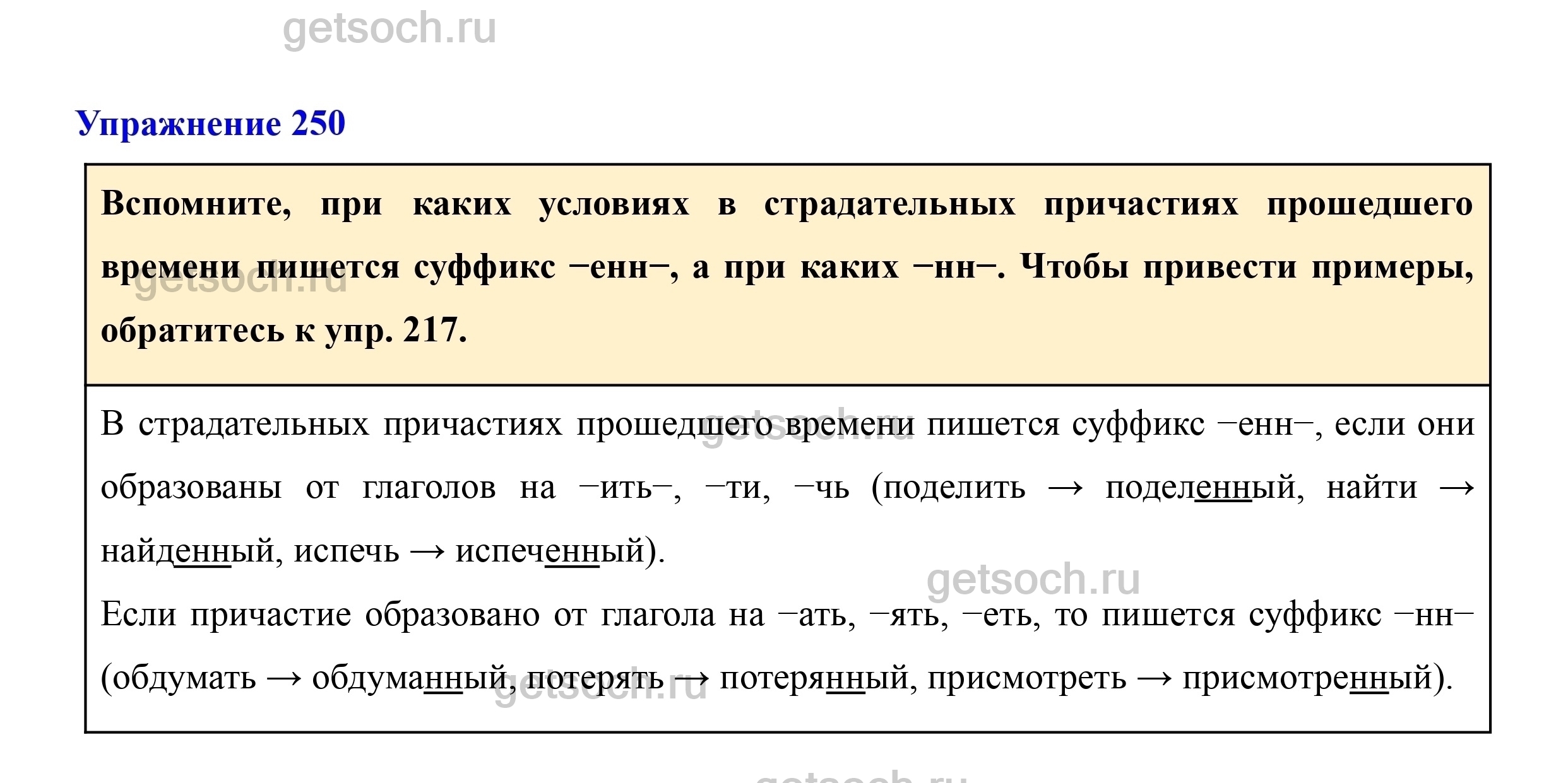 Вспомните, при каких условиях в страдательных причастиях прошедшего времени пишется суффикс −енн−, а при каких −нн−. Чтобы привести примеры, обратитесь к упр. 217.
