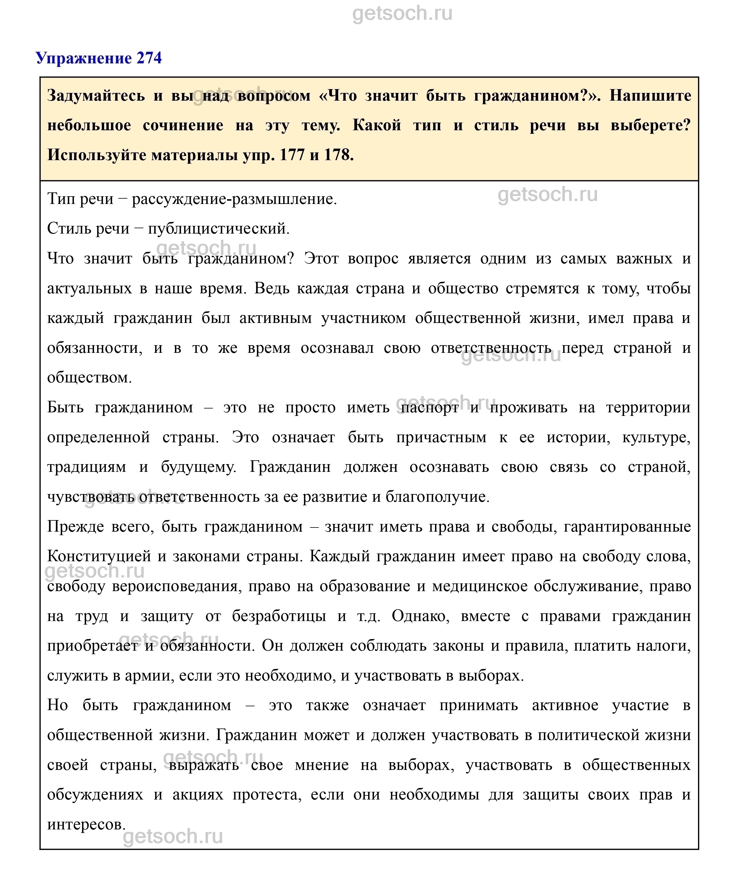 Задумайтесь и вы над вопросом «Что значит быть гражданином?». Напишите небольшое сочинение на эту тему. Какой тип и стиль речи вы выберете? Используйте материалы упр. 177 и 178.