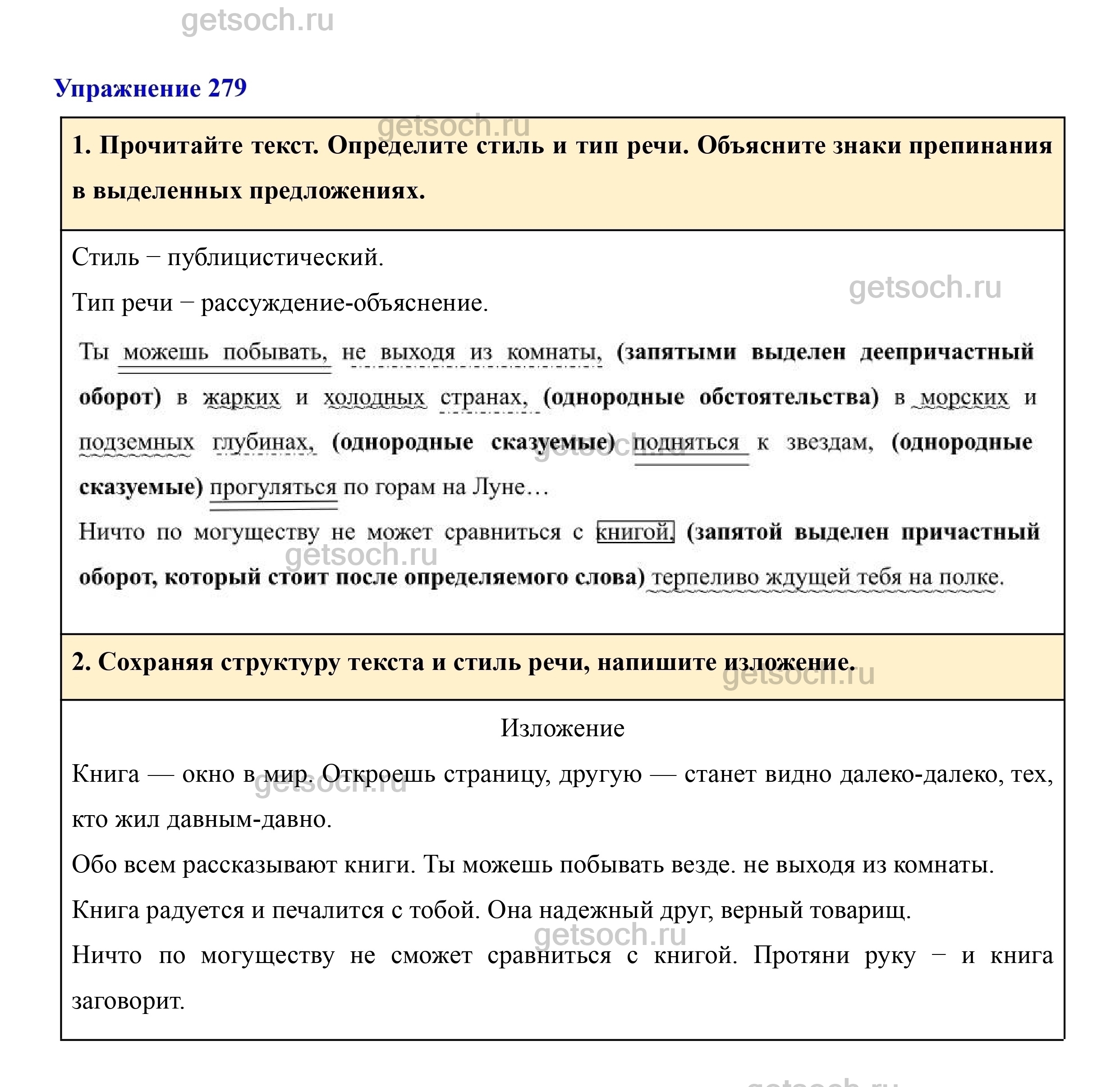 Рассмотрим ответы на Упражнение 279 из учебника по русскому языку для 7 класса Разумовской