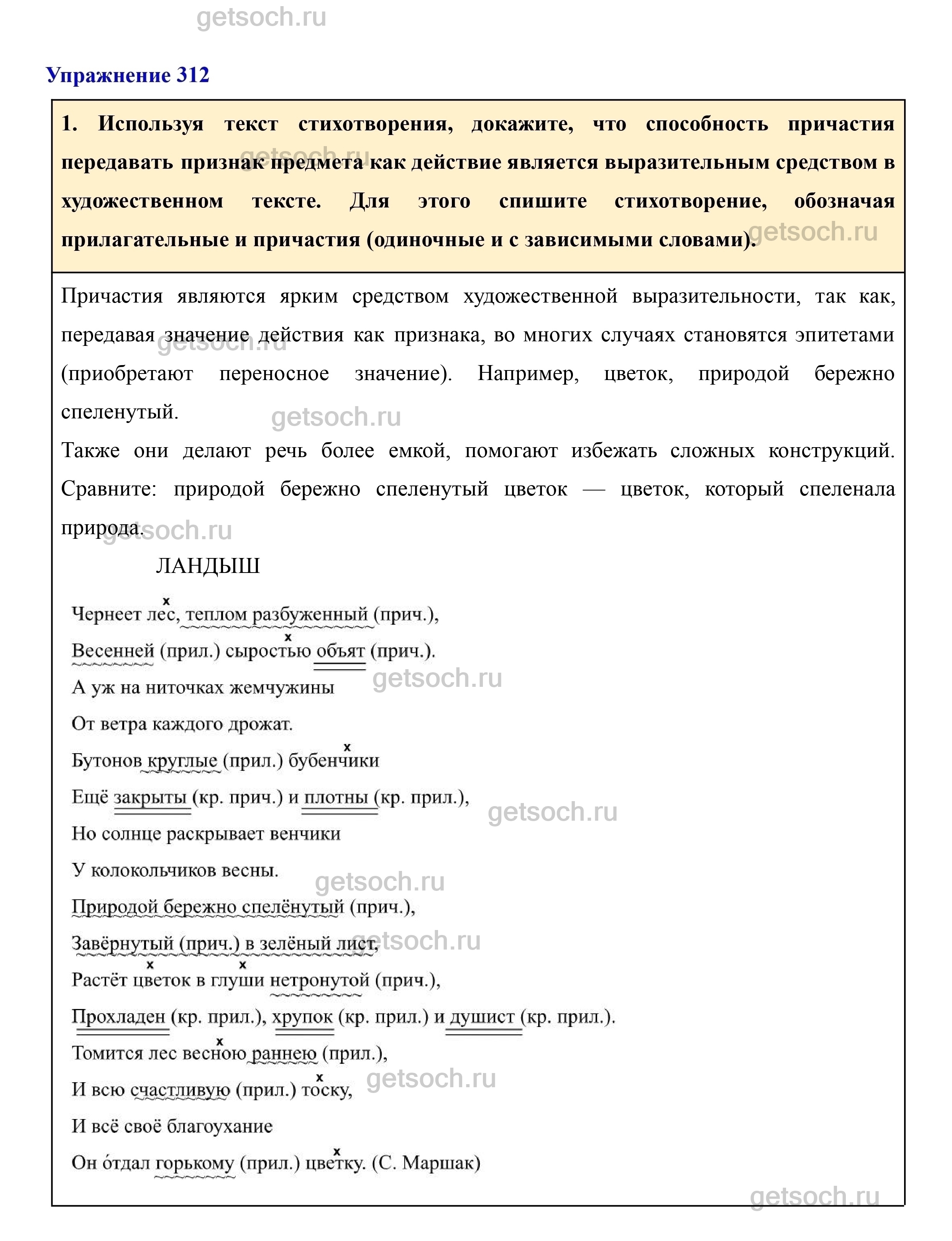 1. Используя текст стихотворения, докажите, что способность причастия передавать признак предмета как действие является выразительным средством в художественном тексте. Для этого спишите стихотворение, обозначая прилагательные и причастия (одиночные и с зависимыми словами).