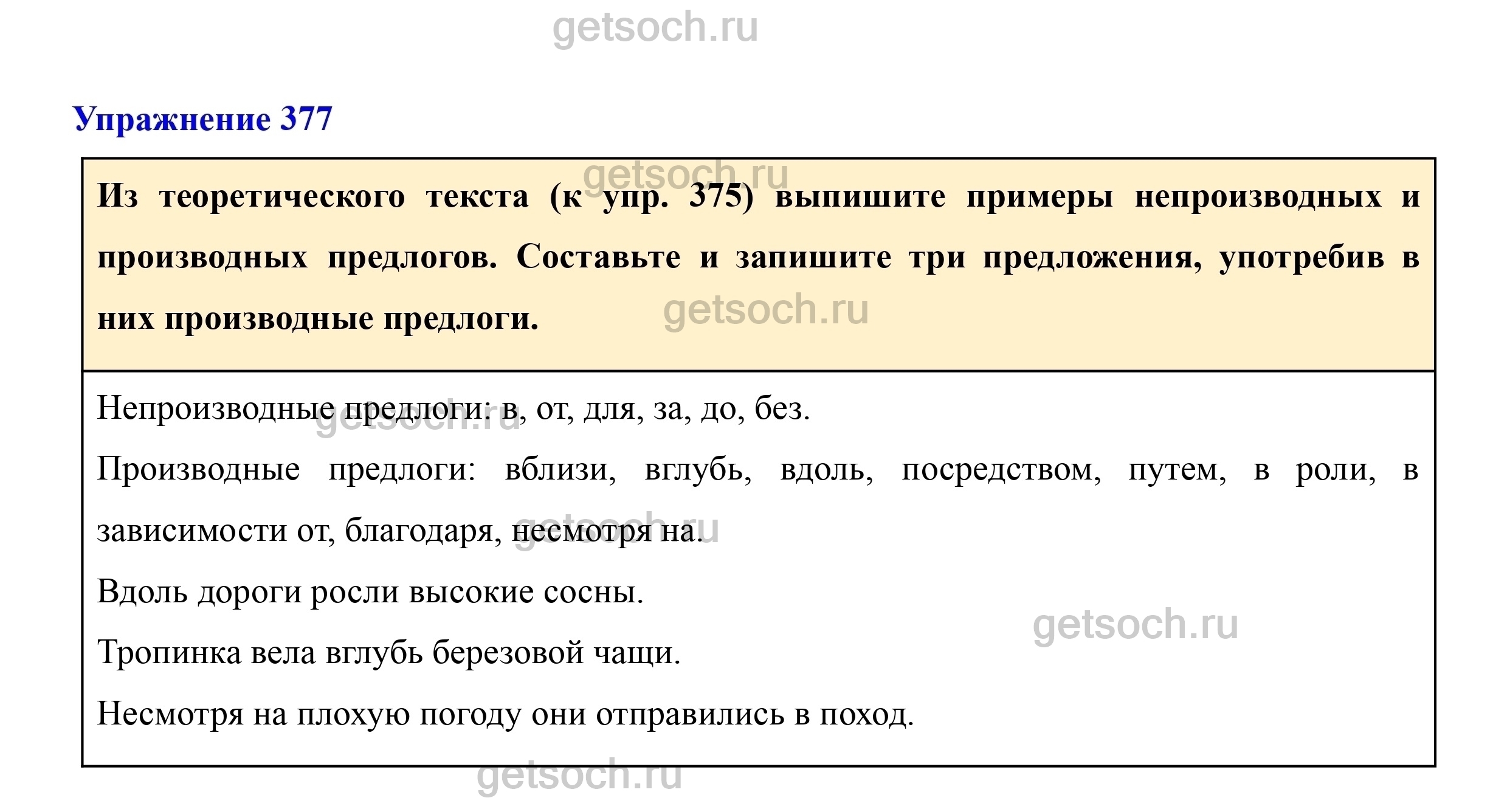 Из теоретического текста (к упр. 375) выпишите примеры непроизводных и производных предлогов. Составьте и запишите три предложения, употребив в них производные предлоги.
