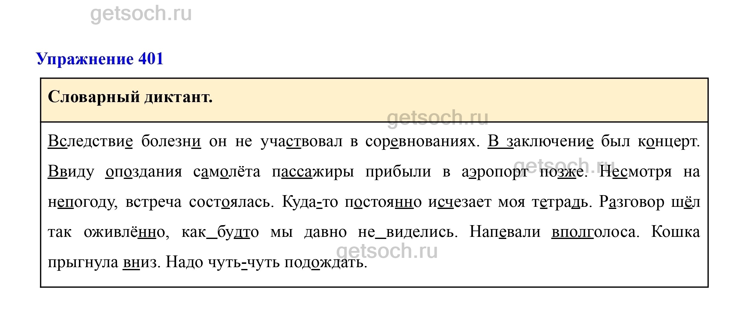 Вследствие болезни он не участвовал в соревнованиях. В заключение был концерт. Ввиду опоздания самолёта пассажиры прибыли в аэропорт позже. Несмотря на непогоду, встреча состоялась. Куда-то постоянно исчезает моя тетрадь. Разговор шёл так оживлённо, как будто мы давно не виделись. Напевали вполголоса. Кошка прыгнула вниз. Надо чуть-чуть подождать.