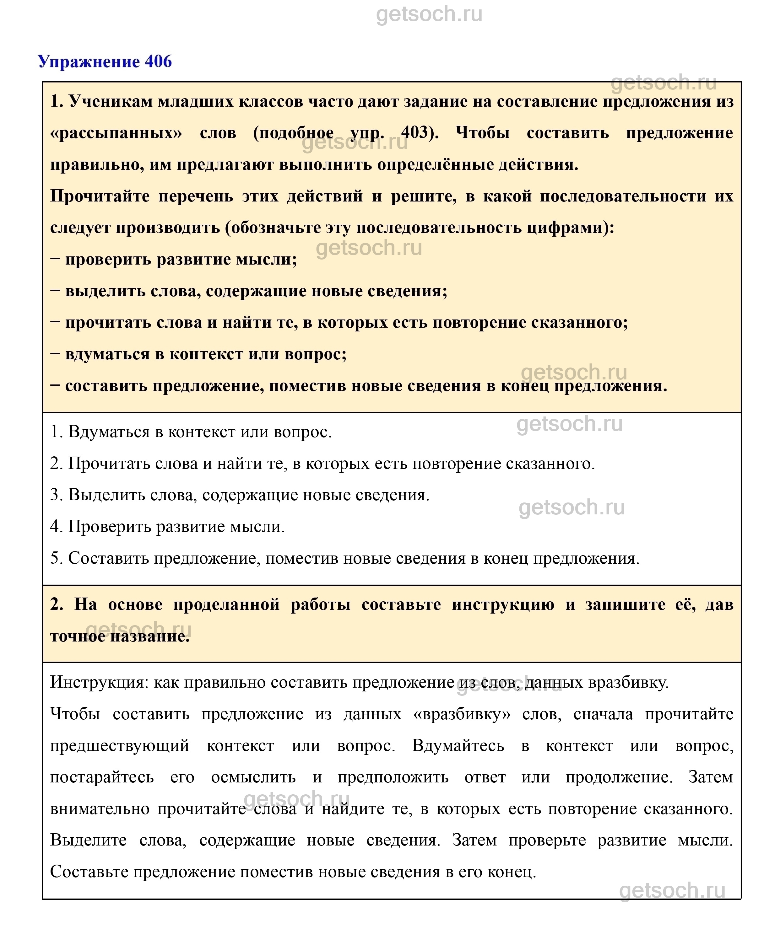 1. Ученикам младших классов часто дают задание на составление предложения из «рассыпанных» слов (подобное упр. 403). Чтобы составить предложение правильно, им предлагают выполнить определённые действия.