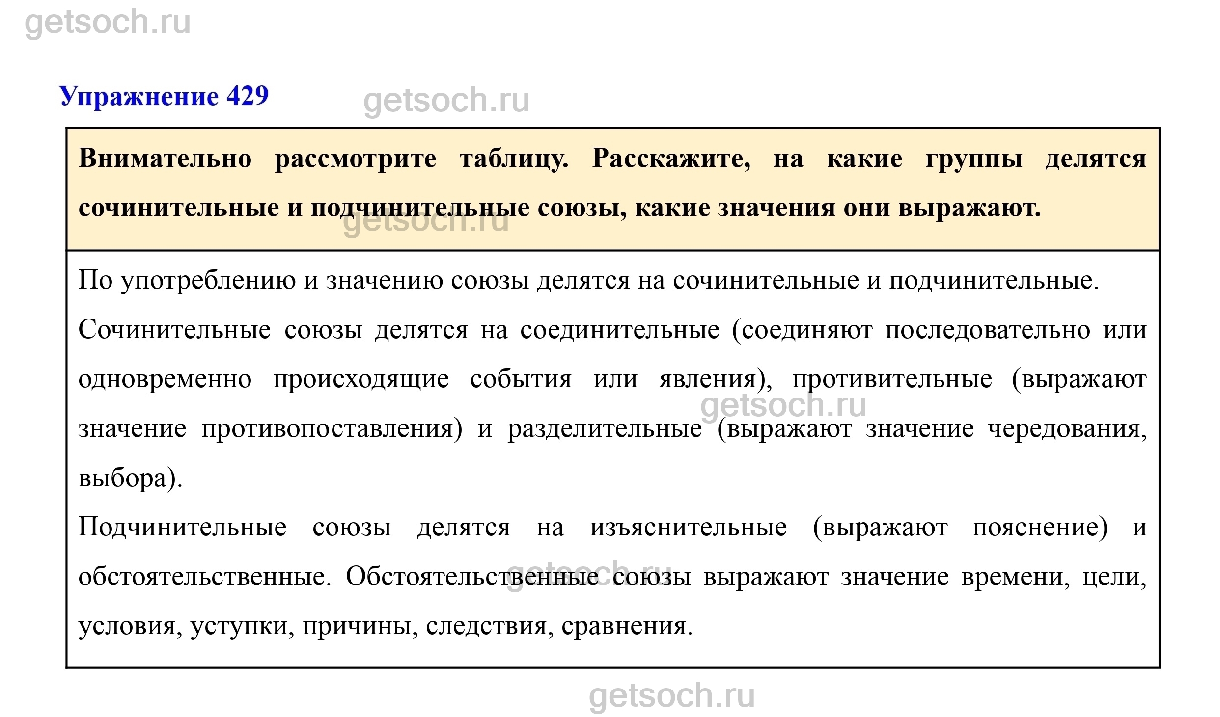 Внимательно рассмотрите таблицу. Расскажите, на какие группы делятся сочинительные и подчинительные союзы, какие значения они выражают.
