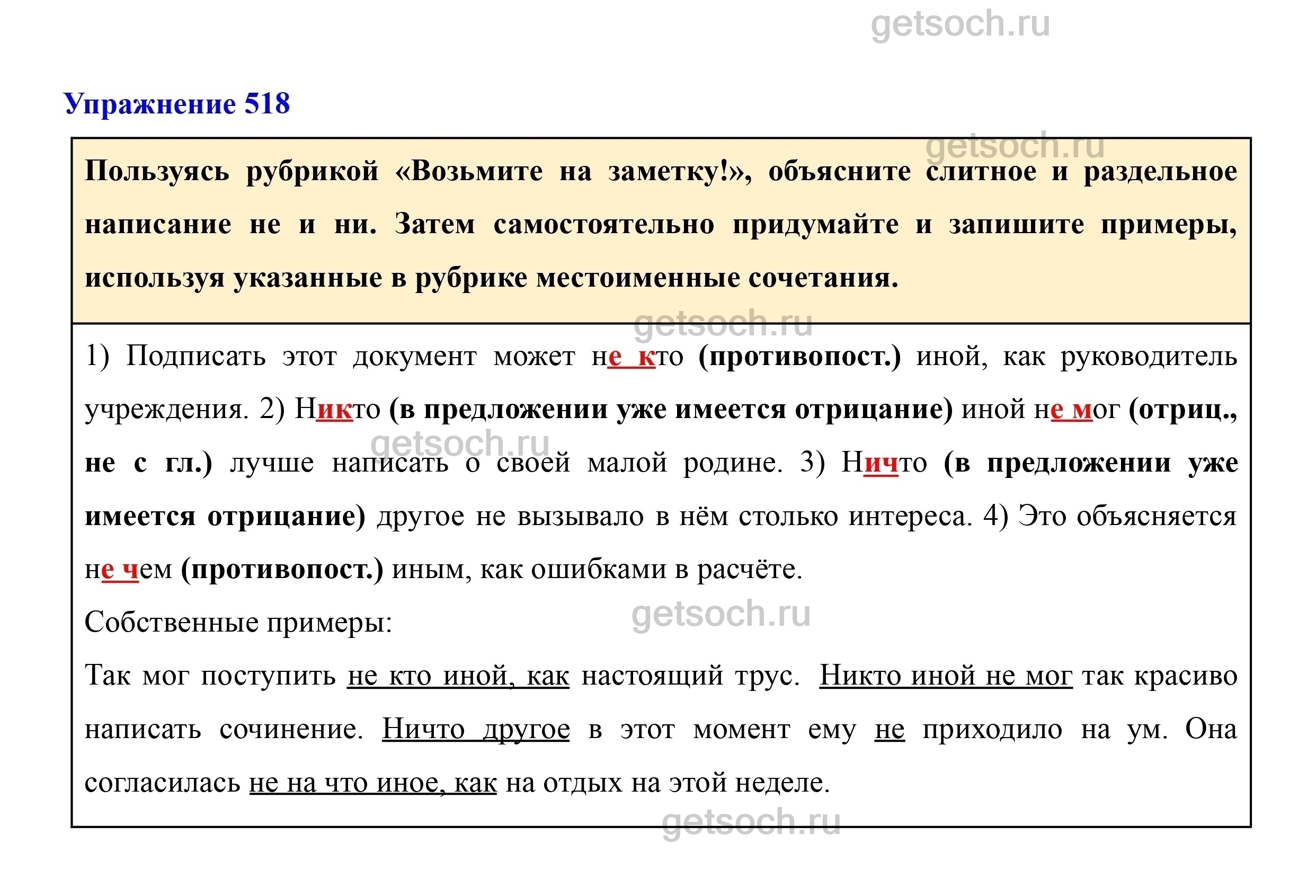 Пользуясь рубрикой «Возьмите на заметку!», объясните слитное и раздельное написание не и ни. Затем самостоятельно придумайте и запишите примеры, используя указанные в рубрике местоименные сочетания.