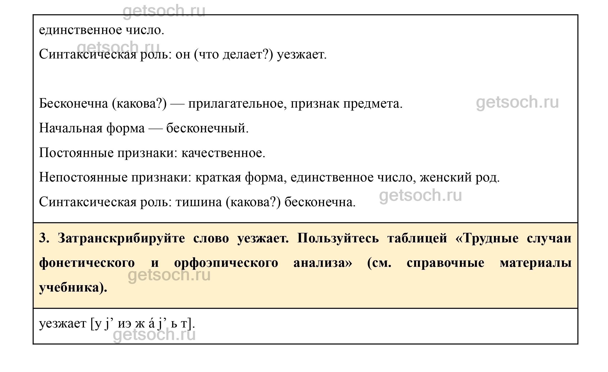 3. Затранскрибируйте слово уезжает. Пользуйтесь таблицей «Трудные случаи фонетического и орфоэпического анализа» (см. справочные материалы учебника).