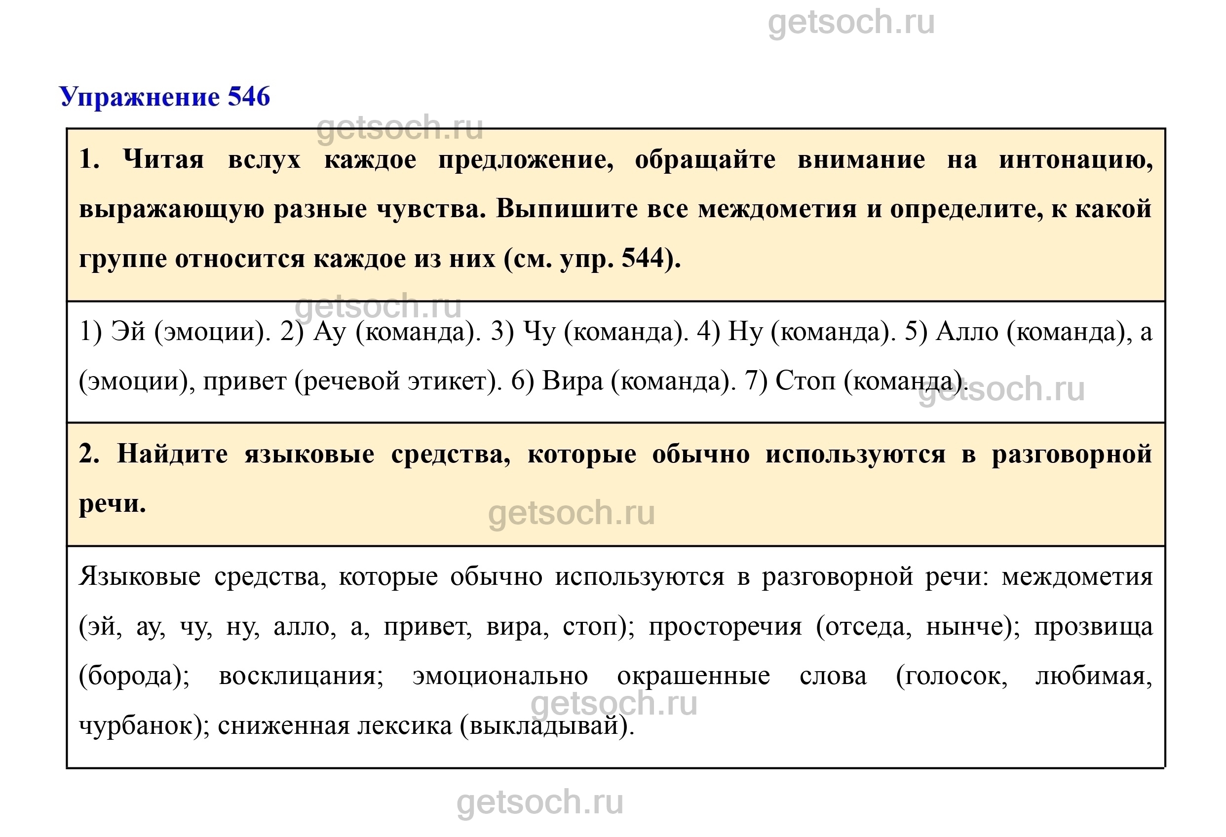 1. Читая вслух каждое предложение, обращайте внимание на интонацию, выражающую разные чувства. Выпишите все междометия и определите, к какой группе относится каждое из них (см. упр. 544).