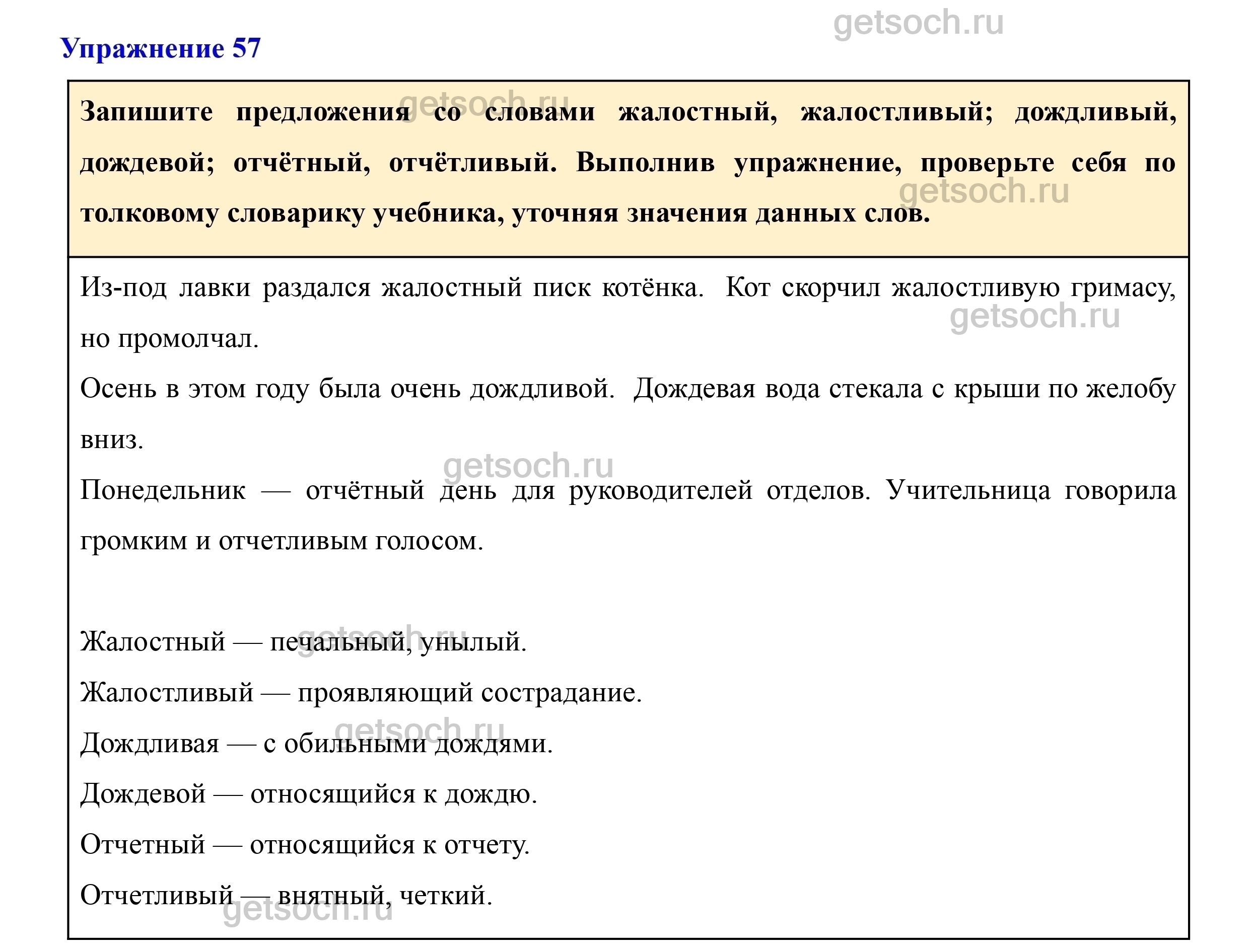 Запишите предложения со словами жалостный, жалостливый; дождливый, дождевой; отчётный, отчётливый. Выполнив упражнение, проверьте себя по толковому словарику учебника, уточняя значения данных слов.