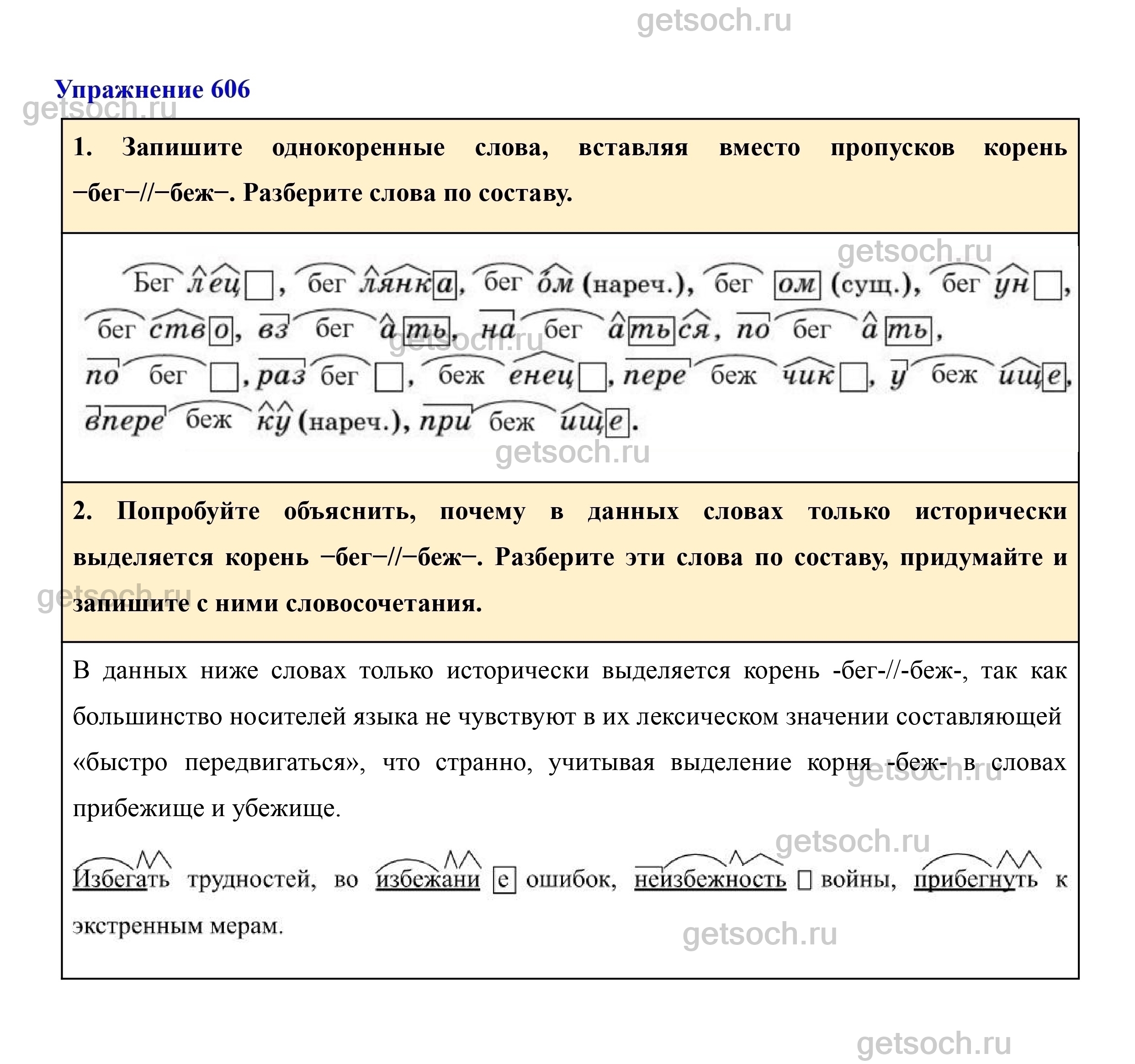 2. Попробуйте объяснить, почему в данных словах только исторически выделяется корень −бег−//−беж−. Разберите эти слова по составу, придумайте и запишите с ними словосочетания.