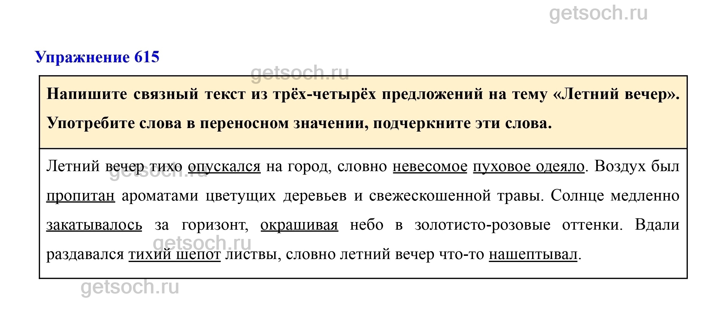 Напишите связный текст из трёх-четырёх предложений на тему «Летний вечер». Употребите слова в переносном значении, подчеркните эти слова.